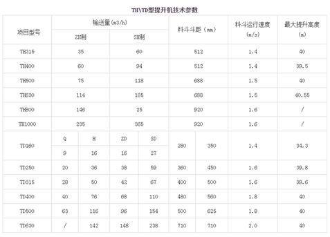 TD\TH型提升机为目前应用较广泛的两款提升机,TD型采用掏取式装料,离心式卸料。特点:适用粉状、粒状和小块状的低磨琢性物料,斗型有Q型(浅斗)、H型(弧底斗)、zd型、中深斗sd型(深斗)四种。TH型采用掏取式装料,重力或混合式卸料,适用于1.51tm3的物料,斗型在zh型(浅斗)和sh(深斗)两种。